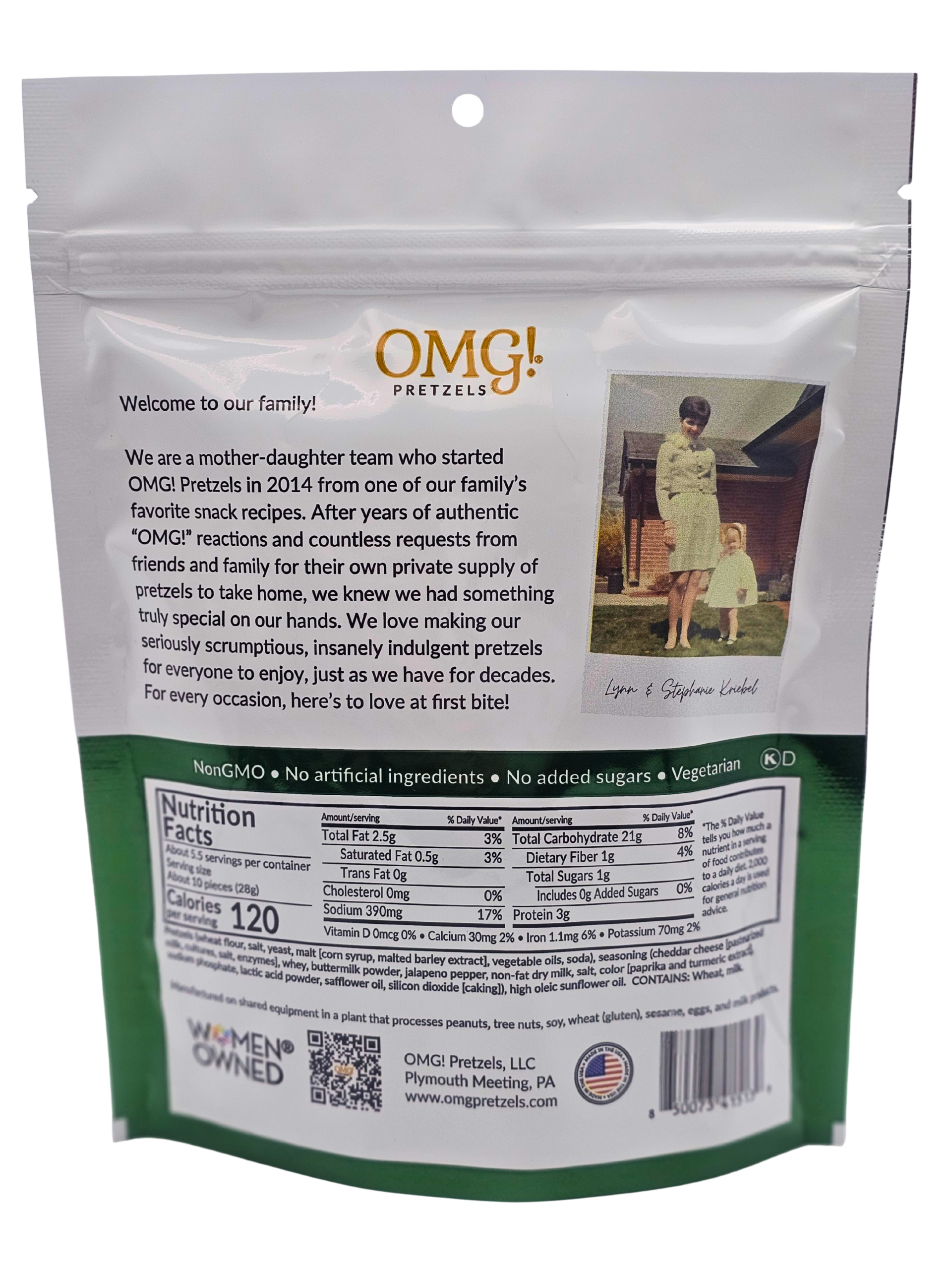 Bold, delicious and crunchy, OMG! Cheddar Jalapeño Pretzels sourdough pretzel seasoned nuggets are the best snack in town. You’ll want to try every award-winning flavor. These savory bites are the ultimate gourmet pretzel snacks! OMG! Pretzels are great for simple and refined entertaining, an afternoon pick-me-up, or to keep the kids happy in the car. We love the cheesy spiciness of our Cheddar Jalapeño Pretzels, especially in recipes like: