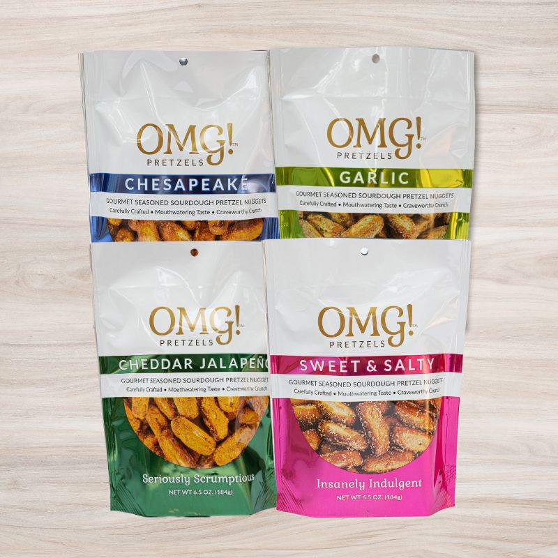 Try the original flavors that put OMG! Pretzels on the map with this variety pack that includes something savory, something spicy, something sweet and everything in between. The first two seasoning blends we developed – Garlic and Sweet & Salty – are family favorites; great for adults and kids alike! Cheddar Jalapeño and Chesapeake rounds out this flavorful collection of pretzel-tastic snacks.
